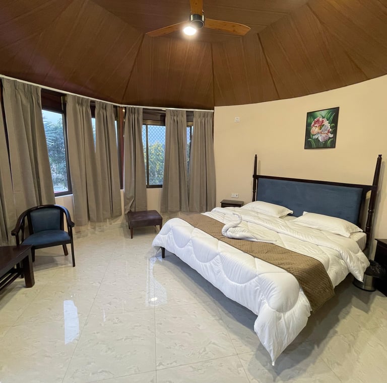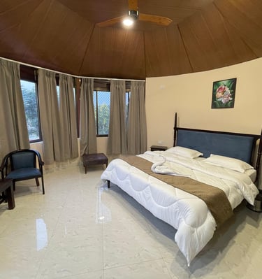 Comfortable cottages and luxury tents with modern amenities, set amidst serene natural surroundings.